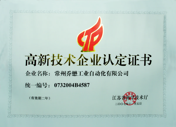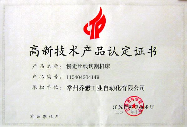 常州乔懋高速细孔放电加工机被评为"高新技术产品"。